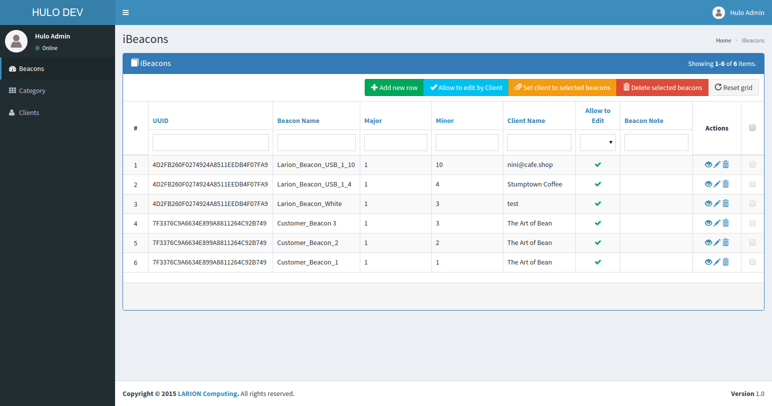 Hulo is an advertising application using mobile and beacon. In backend, administrator can import multiple beacons and assign to the Hulo’s customer (called Hulo client).