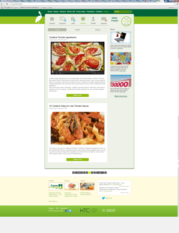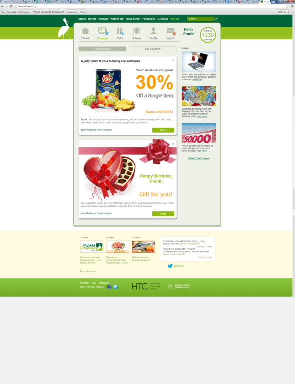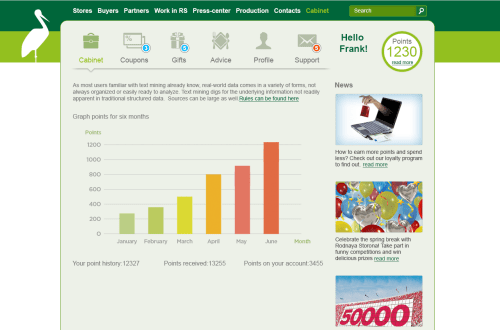 Loyalty Web Cabinet is a web application to promote the loyalty customer program for customers of a CRM system. Users can view their points, points history by chart, their coupons (new and old coupons), gifts (new and old gifts), product’s advices, manage their profiles and add/remove points from the cards of their family members, and give feedbacks about the products.